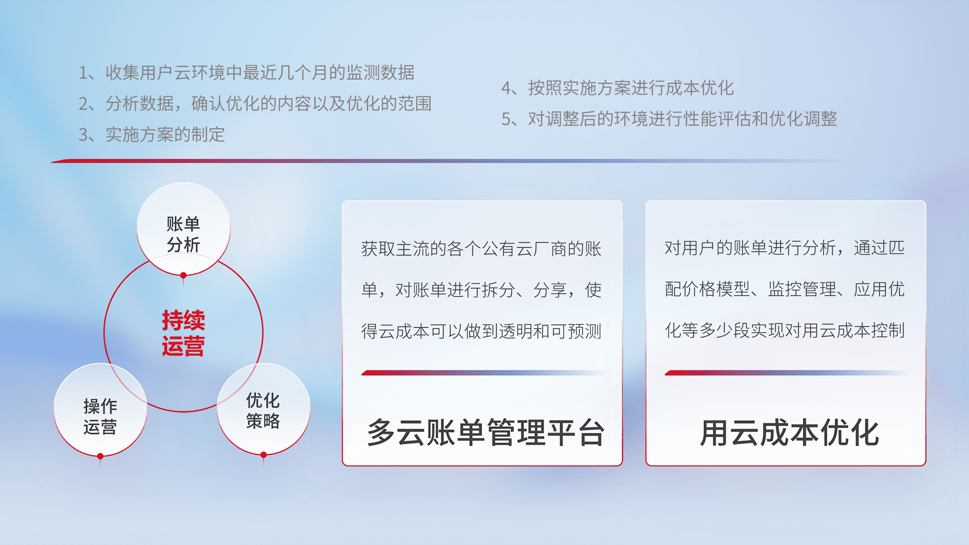 通过多云纳管,,,,以统一的资源数据模型把客户的云资源进行抽象和封装,,进而实现对多云资源的统一操作,,,,保障云资源管理的可靠性、、、稳定性与可用性。。。。量身定制化运维内容,,配置、、、、开发运维、、、补丁管理、、、备份、、监控、、、、认证和访问管理、、、、审计和日常巡检等,,,保障在用云过程中的可靠度,,,稳定度以及高可用率。。